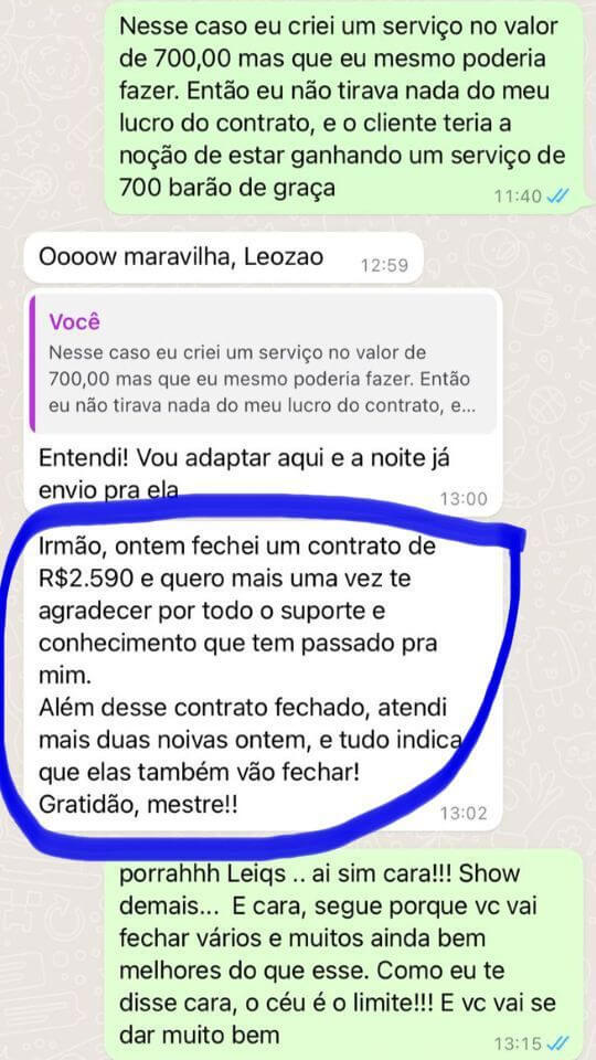 Hoje eu faço no mínimo R$2.500,00 (DOIS MIL E QUINHETOS REAIS) em um único casamento de forma automática por mês… Muitas vezes, até mais de dez mil reais em menos de 30 dias.